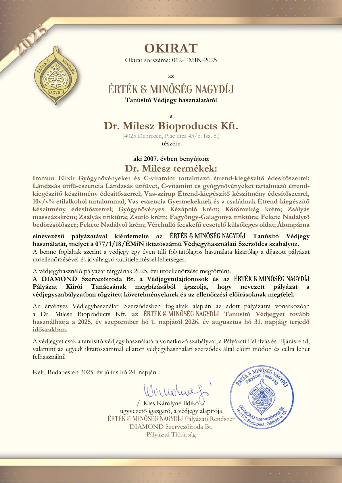 Örömmel tájékoztatjuk Önöket, hogy a Dr. Milesz termékcsalád 2025-ben ismét kiérdemelte az Érték és Minőség Nagydíj Tanúsító Védjegy használatát.