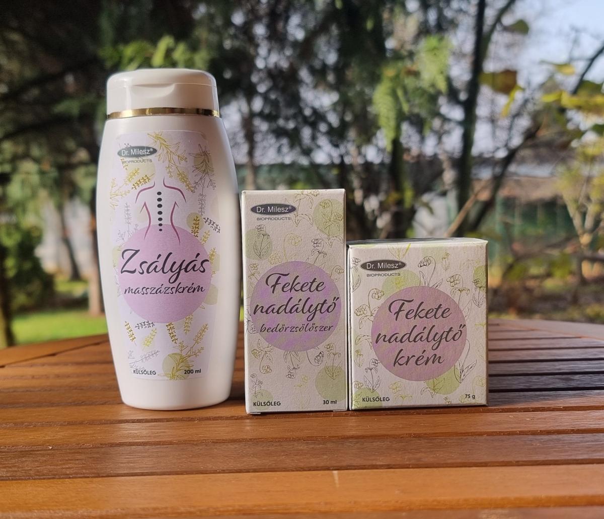 A csomag tartalma: 1 db Dr. Milesz Fekete nadálytő bedörzsölőszer, 1 db Dr. Milesz Fekete nadálytő krém,1 db Dr. Milesz Zsályás masszázskrém